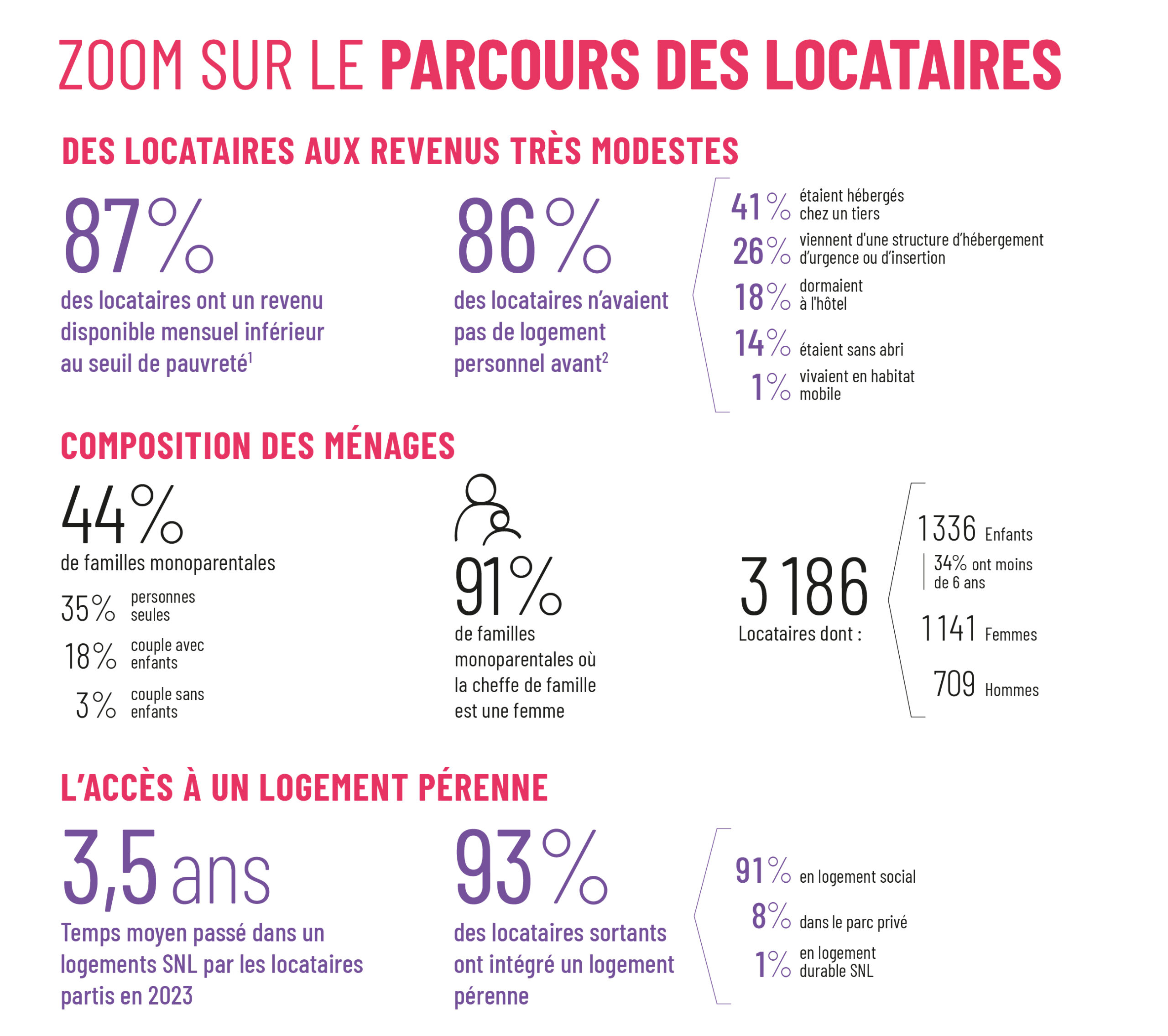 Plus de 14 000 personnes ont été accueillies depuis la création de l’association en 1988. Les logements sont destinés à des familles ou personnes seules en situation de grande précarité, privées de logement.