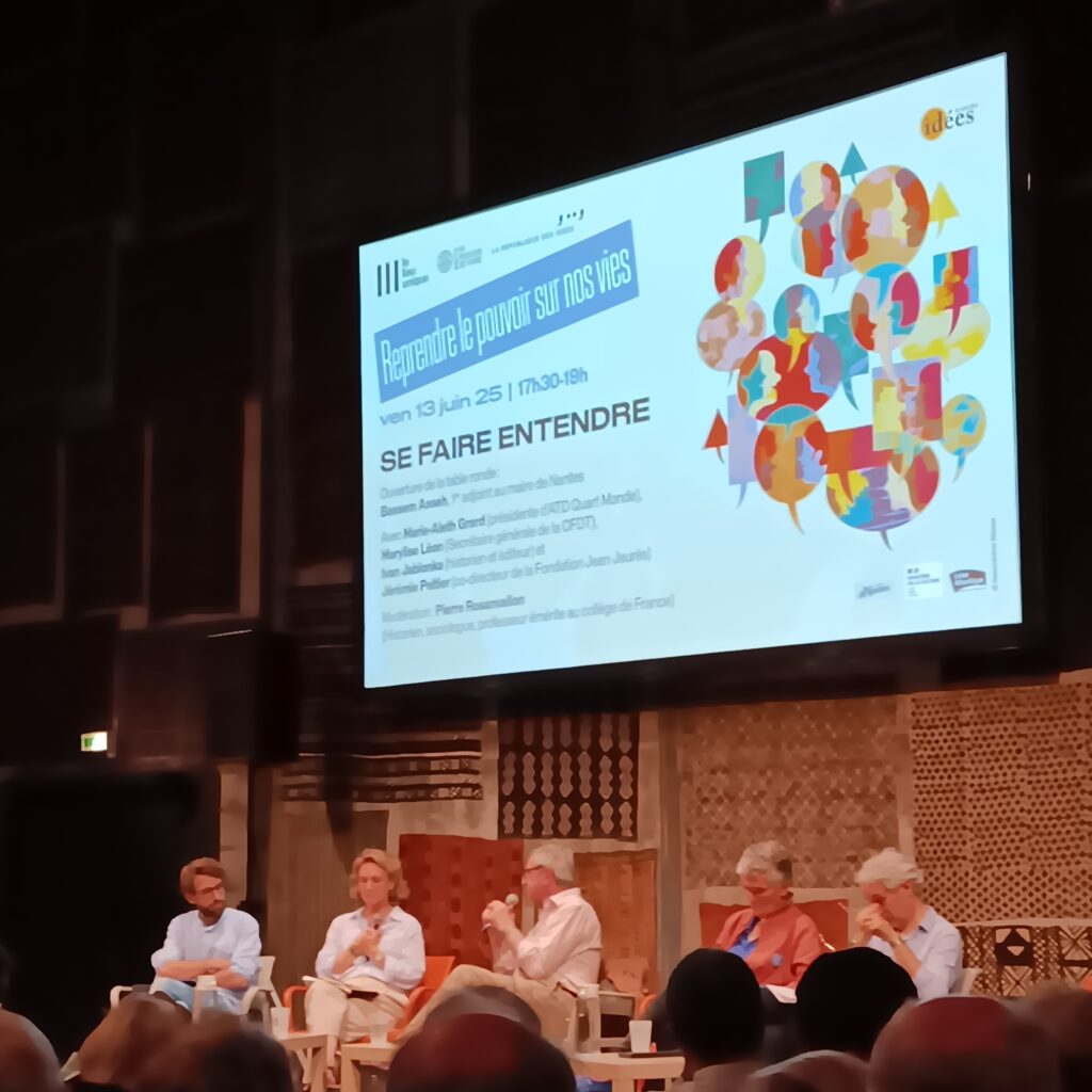 Les 13 et 14 juin à Nantes, au Lieu Unique, le Pacte du pouvoir de vivre a organisé, avec la République des idées du sociologue Pierre Rosanvallon, deux jours de débats sur « Comment reprendre le pouvoir sur nos vies et réveiller la démocratie ? ». Nombre d’associations nationales et locales du Pacte étaient présentes, ainsi qu’un vaste public, venu écouter et interpeller les personnalités des forums : l’historien Patrick Boucheron, l’anthropologue Philippe Descola, la philosophe Cynthia Fleury, la défenseure des droits Claire Hédon, etc.
