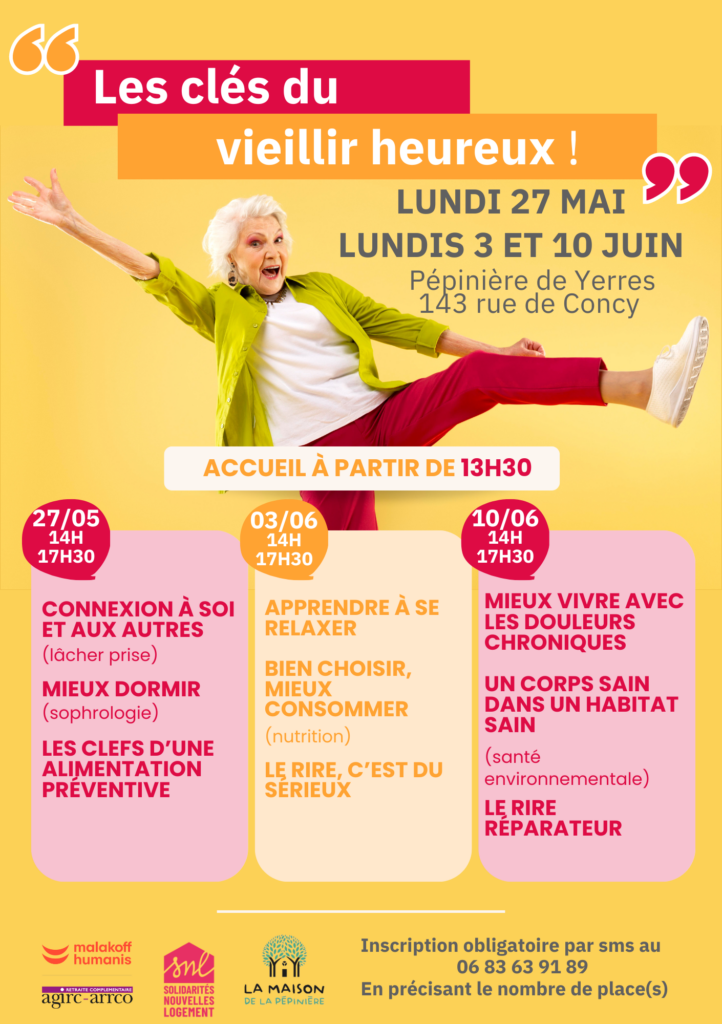 Malakoff Humanis organise en collaboration avec SNL et La Pépinière de Yerres l’évènement « Les clefs du vieillir heureux », un programme conçu pour favoriser le bien être des seniors et encourager un vieillissement heureux et en bonne santé. Les participants sont invités à prendre part à trois sessions d’ateliers autour de la nutrition, de la sophrologie ou encore de la rigologie.