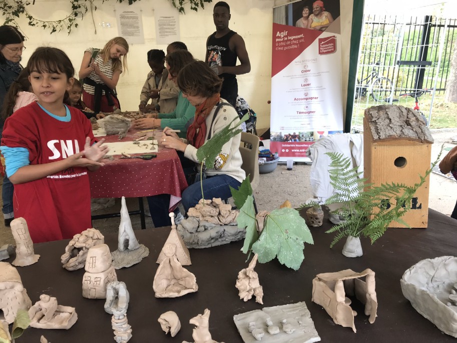 Le groupe local de Solidarités Nouvelles pour le Logement a proposé la construction d’ une œuvre collective en invitant chacun à fabriquer une petite maison en terre symbolisant sa participation à la construction de la ville.