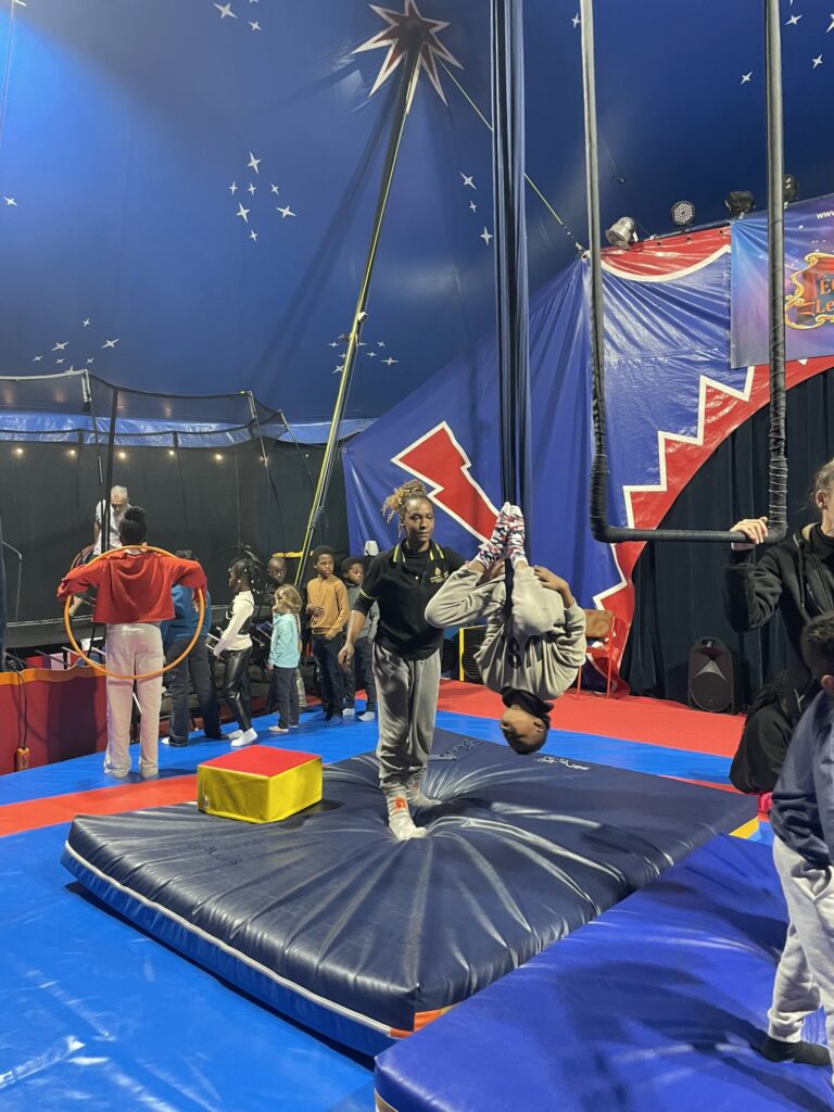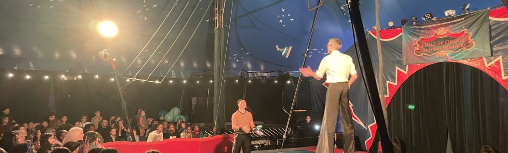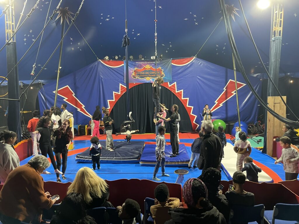 C’est la deuxième fois dans l’année que l’école de cirque des frères Hendricks nous offre une représentation, puisqu’en décembre 2023 la séance n’a pas pu avoir lieu et a été reportée à mars 2024. Il y a moins de monde aux ateliers, mais le chapiteau se remplit petit à petit et la salle est bientôt comble.