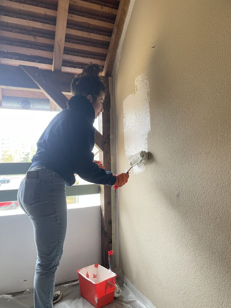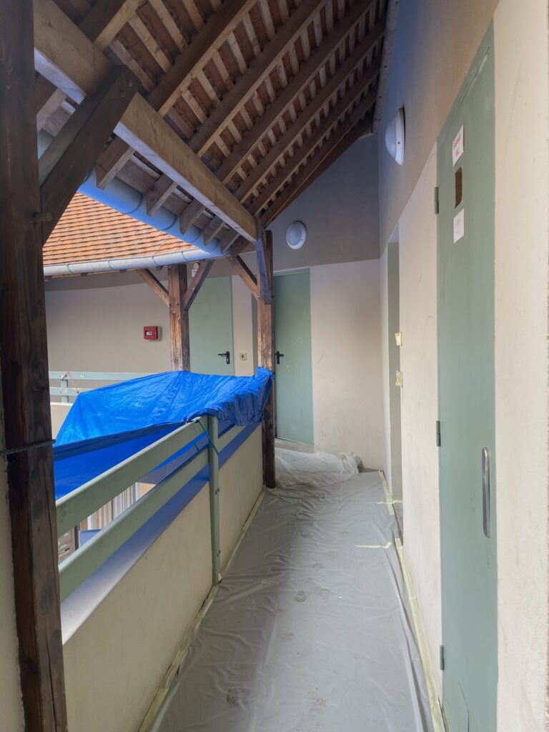 La météo n’a pas pu jouer les trouble-fêtes car les tâches nécessitant le répit de la pluie ont eu lieu le matin tandis que l’installation d’une bâche de protection garantissait le bon déroulement du chantier peinture des murs extérieurs de la résidence.