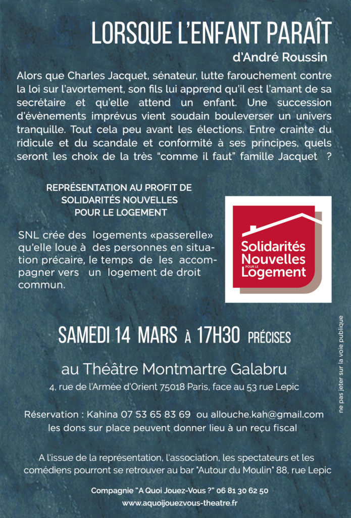 La compagnie de théâtre » A Quoi Jouez-Vous ? » a décidé de renouveler l’expérience et de jouer la pièce « Lorsque l’enfant paraît » aux profits de SNL Paris.